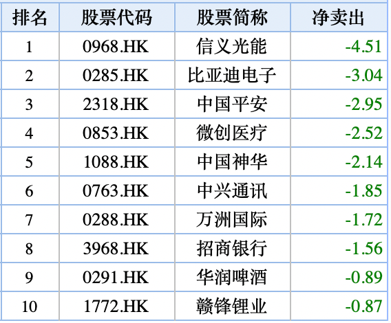 本周南下资金卖出金额最多的标的为信义光能,一周净卖出为4.51亿港元。此外,本周南下资金还卖出比亚迪电子、中国平安、微创医疗、中国神华、中兴通讯等个股。