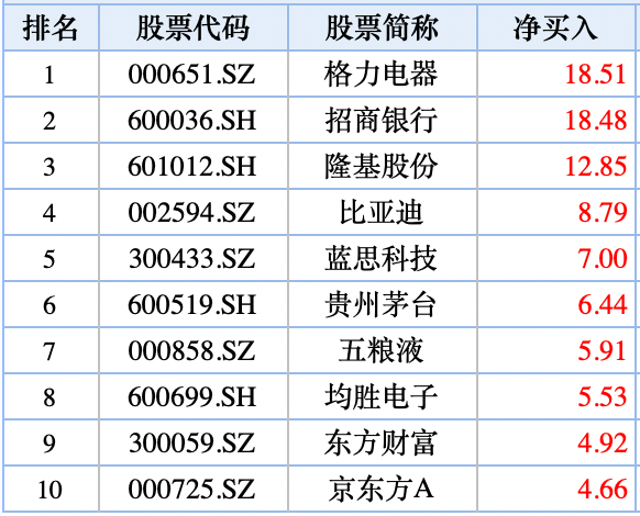 此外,北上资金还净买入隆基股份、比亚迪、蓝思科技、贵州茅台、五粮液等标的。