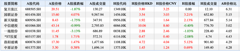 个股方面,复旦张江、国联证券、新天绿能、中信建投、一拖股份等个股仍然位列溢价榜首,投资者可关注相关个股估值回归机会。