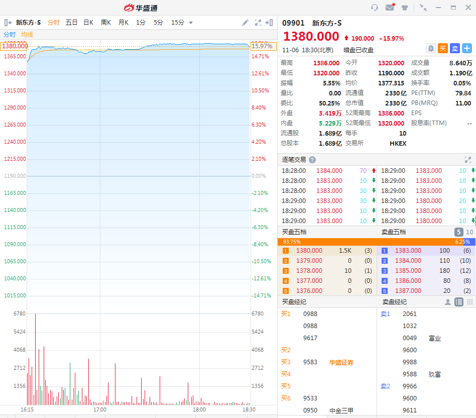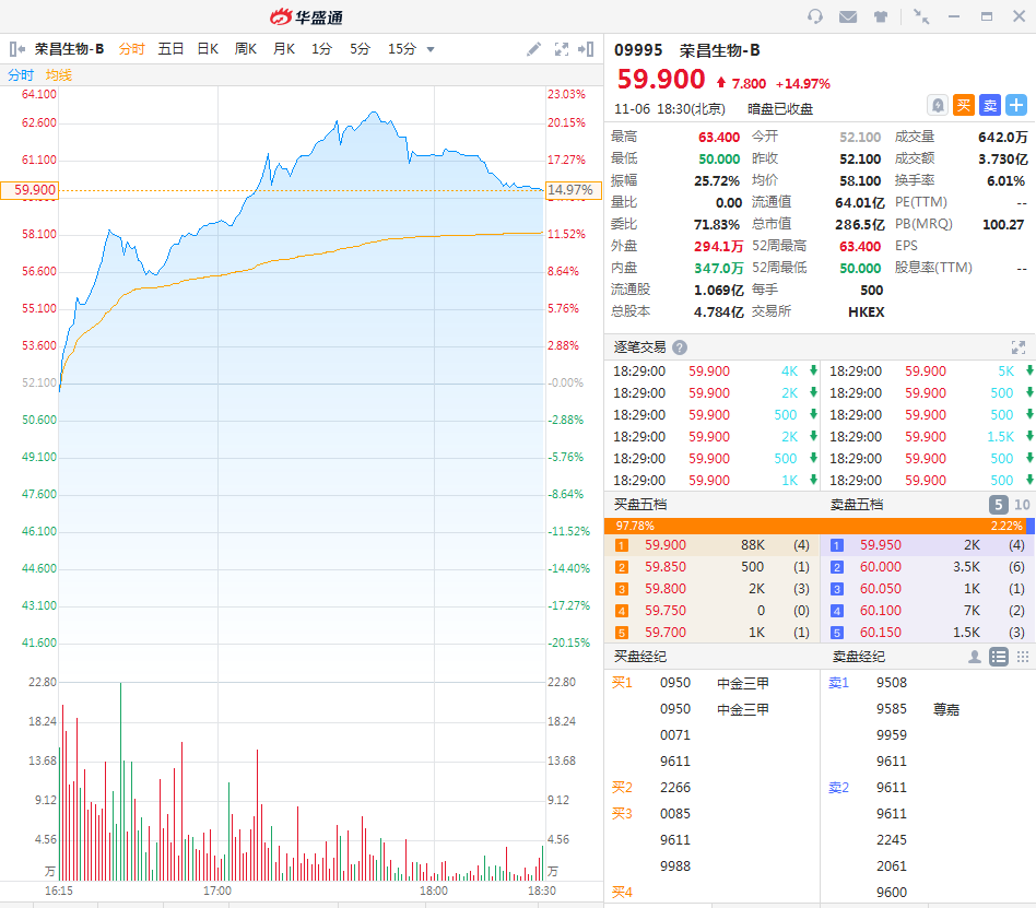 华盛资讯11月6日讯,截至收盘,荣昌生物-B(09995.HK) 暗盘收盘报价59.9港元,较发行价52.1港元涨幅为14.97%,一手账面盈利3900港元。最新成交额3.73亿港元,总市值为286.5亿港元,将于11月9日正式上市;新东方-S(09901.HK)暗盘收盘报价1380.0港元,涨幅为15.97%,一手账面盈利1900港元。最新成交额1.19亿港元,总市值为2330亿港元,该股亦将于11月9日正式上市。