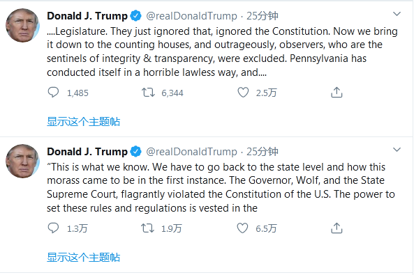 特朗普先是写道:“‘这是我们所知道的。我们必须回到州一级来看看这个泥沼最初是如何形成的。(宾夕法尼亚州)州长沃尔夫和州最高法院公然违反了美国宪法。制定这些规章制度的权力属于立法机关……”