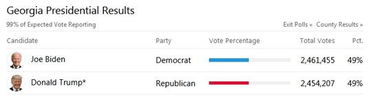 原标题:美媒统计:拜登在佐治亚州暂时领先特朗普7248票