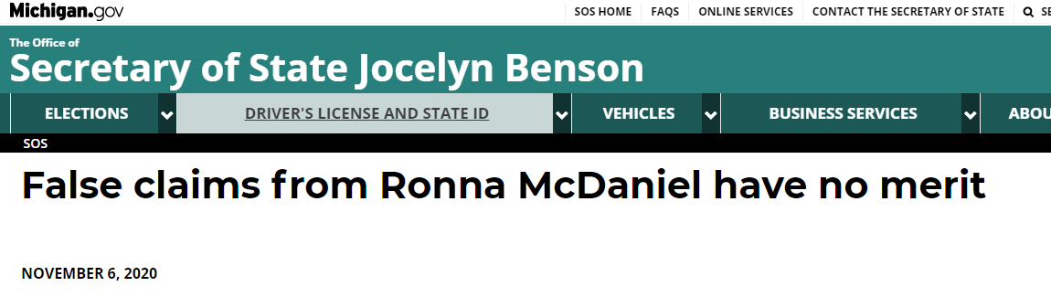 【环球网报道】“软件并未导致选票被计错,这次是人为失误造成的。”当地时间6日,美国密歇根州州务卿乔斯琳·本森在该州政府官网上就美国共和党全国委员会主席伦娜·麦克丹尼尔关于该州计票出错等指控做出回应。此前有报道称,由于该州安特里姆县的计票软件发生故障,该县6000张投给特朗普的选票被算到拜登名下。