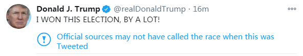 值得一提的是,就在特朗普发完这条推文不久,推特就贴上了一个带有感叹号的标签,上面写道:“当这条推文发出之时,官方来源还没有宣布这场竞选(的结果)。”
