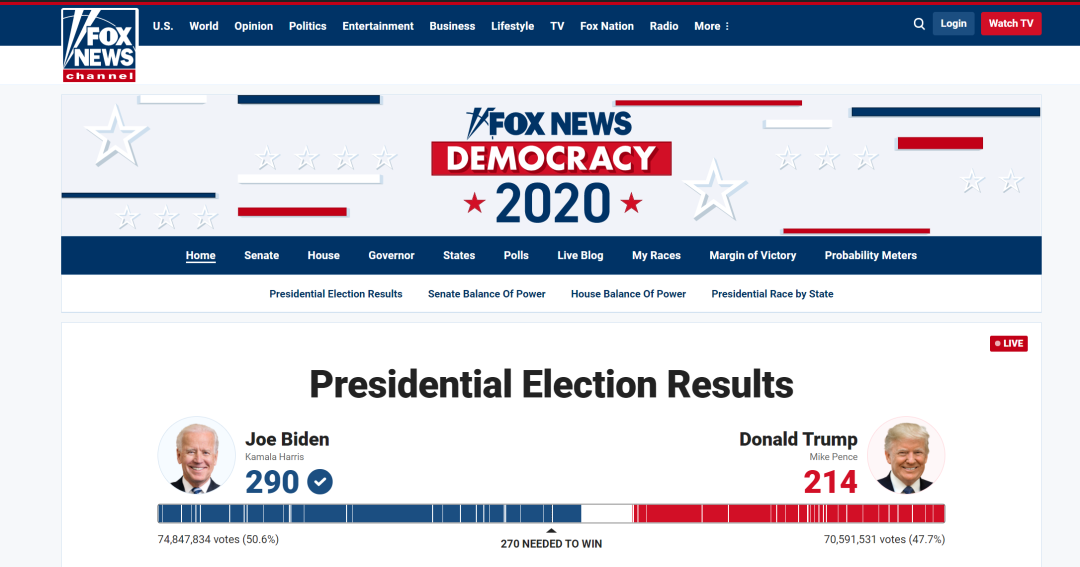 福克斯的统计数据显示,拜登已获得290张选举人票。