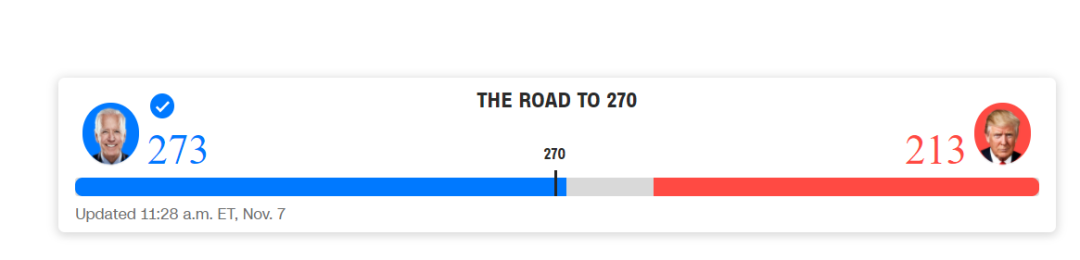 CNN称,拜登将成为美国第46任总统。CNN预测,在拜登赢下宾夕法尼亚州之后,他已获得赢得胜选所需的270张选举人票。报道称,加上宾夕法尼亚州的20张选举人票,拜登现在获得的选举人票达到273张。