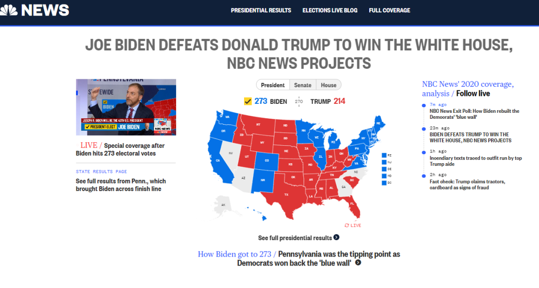 美国全国广播公司(NBC)的统计数据显示,拜登已获得273张选举人票。