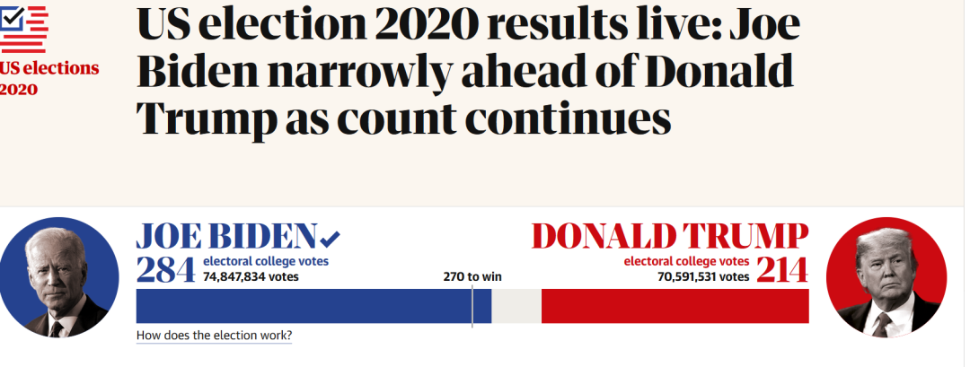 英国《卫报》的统计数据显示,拜登已获得284张选举人票。