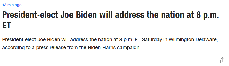 【环球网快讯】据CNN消息,美国总统当选人乔·拜登将于当地时间8日晚8时(北京时间9日上午9时)在特拉华州威尔明向全美发表讲话。