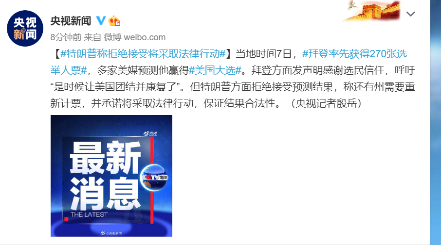 当地时间7日,#拜登率先获得270张选举人票#,多家美媒预测他赢得#美国大选#。拜登方面发声明感谢选民信任,呼吁“是时候让美国团结并康复了”。但特朗普方面拒绝接受预测结果,称还有州需要重新计票,并承诺将采取法律行动,保证结果合法性。(央视记者殷岳)