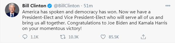原标题:刚刚,克林顿向拜登及哈里斯送出祝贺