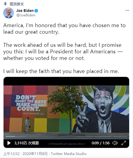 祝贺拜登当选总统,哈里斯当选副总统。感谢选举官员和竞选工作人员,他们为确保创纪录数量的美国人投票进行了孜孜不倦的努力,并在我们国家面临挑战的时刻进行计票。