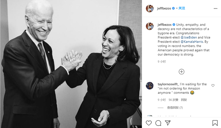 亚马逊CEO杰夫·贝佐斯则在Instagram上放出了一张拜登和哈里斯胜选后的握手合照,祝贺他们当选,并表示: