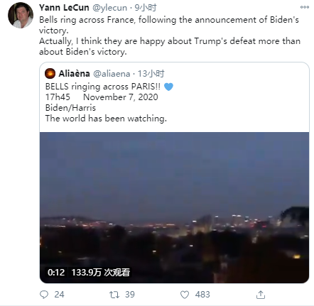 纽约大学教授、Facebook首席人工智能科学家、ACM图灵奖获得者Yann LeCun发了一条略带幽默语调的推文,还附上了一段法国巴黎警钟长鸣欢呼雀跃的视频。