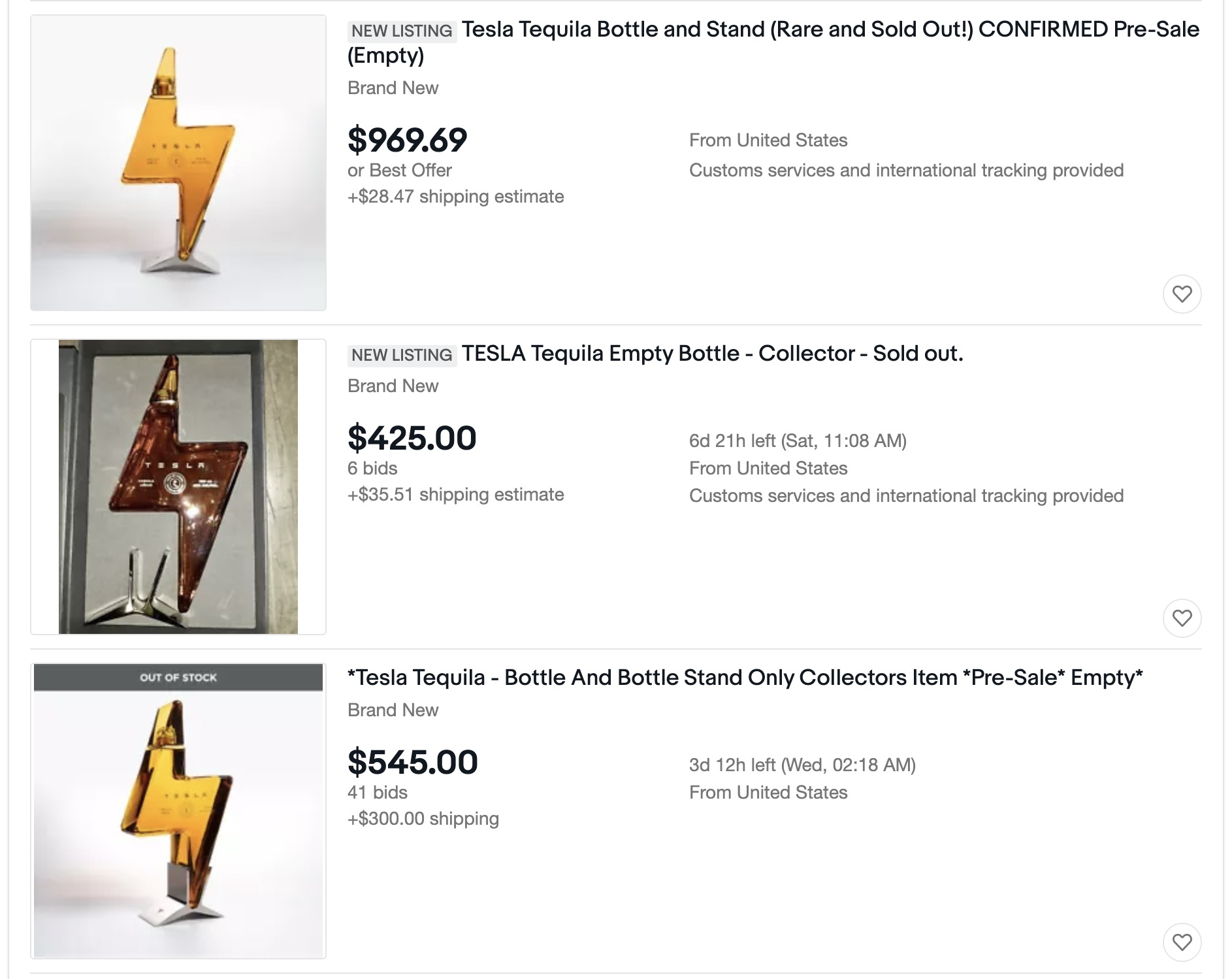 有些卖家甚至只卖特斯拉龙舌兰的空瓶子及其底座,而要价却高达1000美元。