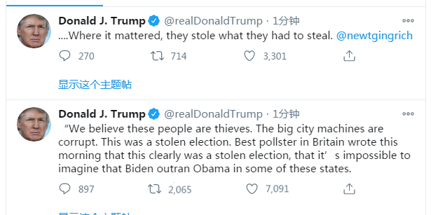 【环球网快讯 记者 乌元春 崔妍】在拜登7日晚向全美发表“胜选宣言”后,推特认证已被改为“美国第45任总统”的特朗普,在推特上连续发布4条推文后,又发了两条推文。