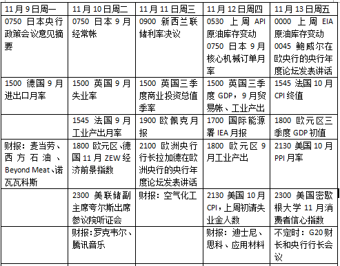 上月末欧央行行长拉加德在议息会议后的新闻发布会上说,欧元区经济复苏正在失去动力,为12月推出更多宽松政策奠定了基础。本周拉加德将出席欧央行“转型世界中的央行”论坛,可关注其有关经济前景和货币政策的表述。