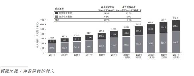 中国全业态物业管理及商业运营服务市场收入总额由2014年的2828亿元人民币增加至2019年的4709亿元人民币,年复合增长率为10.7%。根据弗若斯特沙利文的资料披露,未来随着国内商业运营市场的发展和日趋成熟,该市场规模将不断扩大,预计于2024年将达到人民币6982亿元,2019年至2024年的复合年增长率为8.2%。