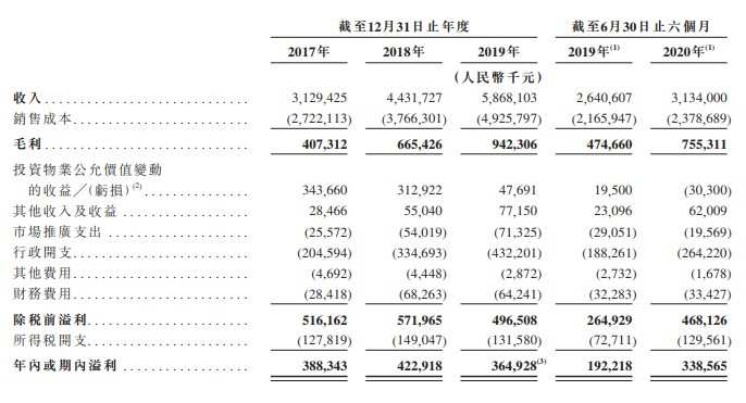 招股书显示,2017年-2020年上半年,华润万象生活分别实现收入31.29亿元(单位为“人民币”,下同)、44.31亿元、58.68亿元、31.34亿元。同期,毛利分别为4.07亿元、6.65亿元、9.42亿元、7.55亿元;毛利率分别为13.0%、15.0%、16.1%、24.1%。