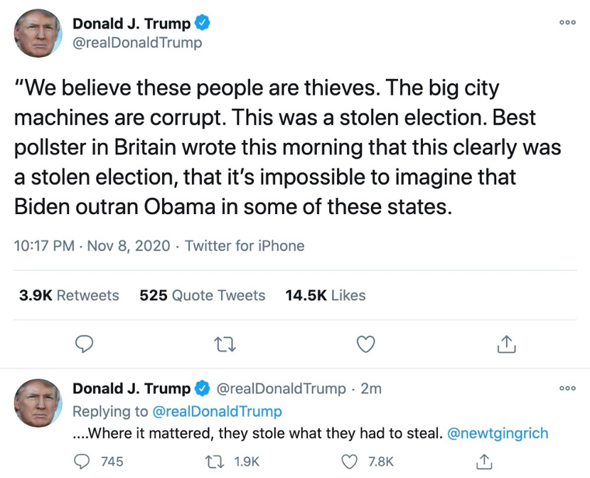 当地时间8日,特朗普在推特上发文称:“我们相信这些人是小偷。大型城市机器是腐败的。这是一场偷来的选举。英国最好的民调专家今天早上写道,这显然是一场偷来的选举,很难想象拜登在其中一些州的支持率超过奥巴马。重要的是,他们偷了不得不偷(才能得到)的东西。”