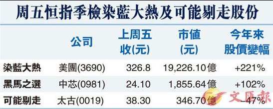 据香港文汇报报道,(记者周绍基)本年最后一次恒生指数季检,将于本周五(13日)收市后公布,市场预期,上次季检时意外落选的染蓝大热美团(3690),入选的机会最大。另外,中芯(0981)的股价虽较历史高位跌逾半,但市值仍然高达1,855亿元,若以恒指50只成份股市值计,中芯的排名可达第28,加上中芯交投活跃,日均成交额绝对可跻身蓝筹前列位置。至于太古(0019)则最有可能被剔出蓝筹;而根据市值排名,中石油(0857) H股因市值不足500亿元,也有可能让出位置。