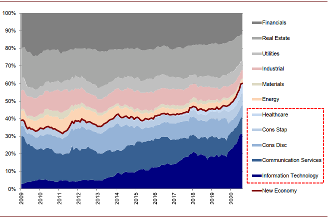 长期角度来看,我们认为香港作为投资中国新经济桥头堡的地位将日益巩固,这不仅会提升香港市场对长线投资者的吸引力,港股市场这一结构性变化也契合十四五规划中国经济转型长期趋势,即新经济、数字化转型、消费升至与制造业升级、以及绿色发展等等。