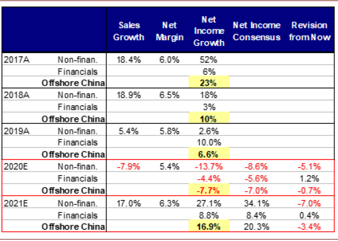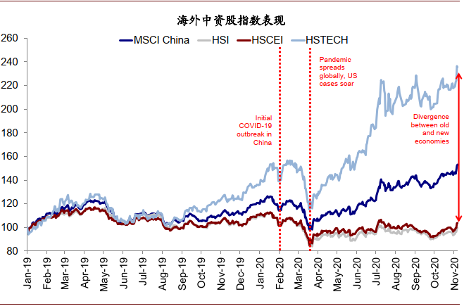 图表:在2020年1季度经历了两次暴跌之后,MSCI China大幅反弹,而恒生指数(HSI)和国企指数(HSCEI)缺乏动力