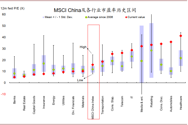 图表:MSCI China目前市盈率达到16年历史区间高位,同时行业估值出现极端分化