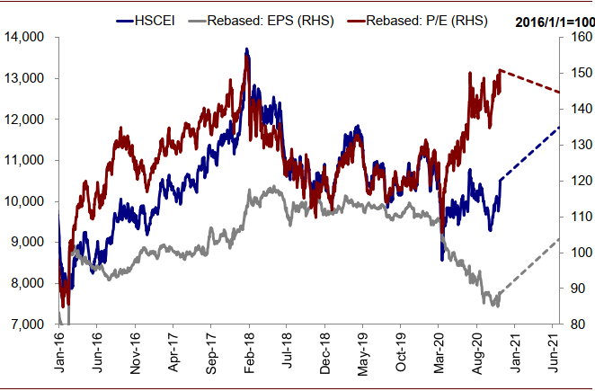 图表:我们预计国企指数(HSCEI)将在2021年达到11800,MSCI China将在2021年达到120,分别较当前水平高出12.4%和10%