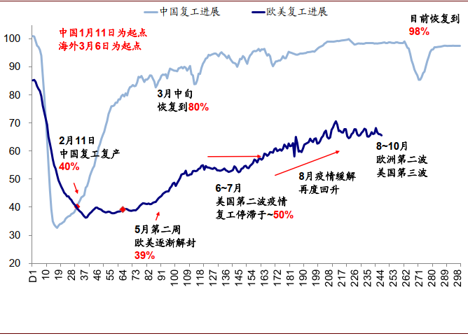 图表:中国的复工进度已达到98%,遥遥领先于欧洲和美国