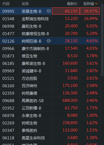 11月9日消息,港股生物技术板块集体走高,荣昌生物涨近27%,金斯瑞生物涨近17%,嘉和生物涨6.92%,欧康维视生物涨5.29%,药明巨诺涨4.65%,康宁杰瑞制药涨超4%。