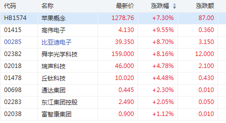 苹果概念股全线爆发,截至发稿,高伟电子(01415)涨9.55%,报4.13港元;比亚迪电子(00285)涨8.7%,报39.35港元;舜宇光学(02382)涨8.16%,报159港元;瑞声科技(02018)涨4.78%,报46港元。