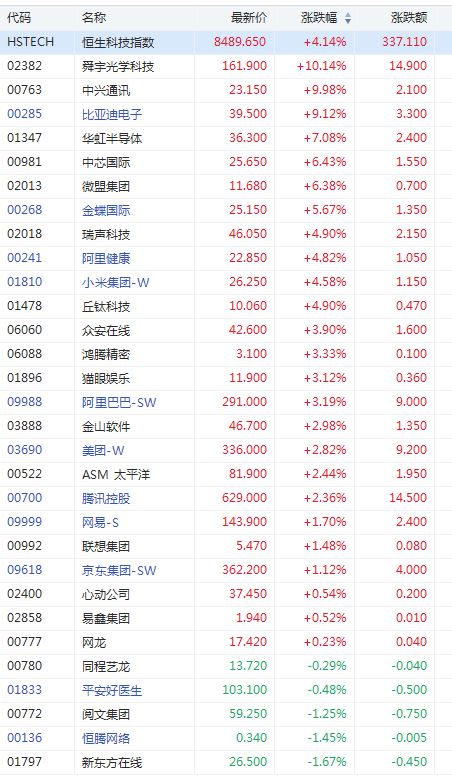 舜宇光学大涨10%,领涨指数成分股。中兴通讯、比亚迪电子涨超9%,华虹半导体涨超7%,中芯国际、微盟集团涨超6%。