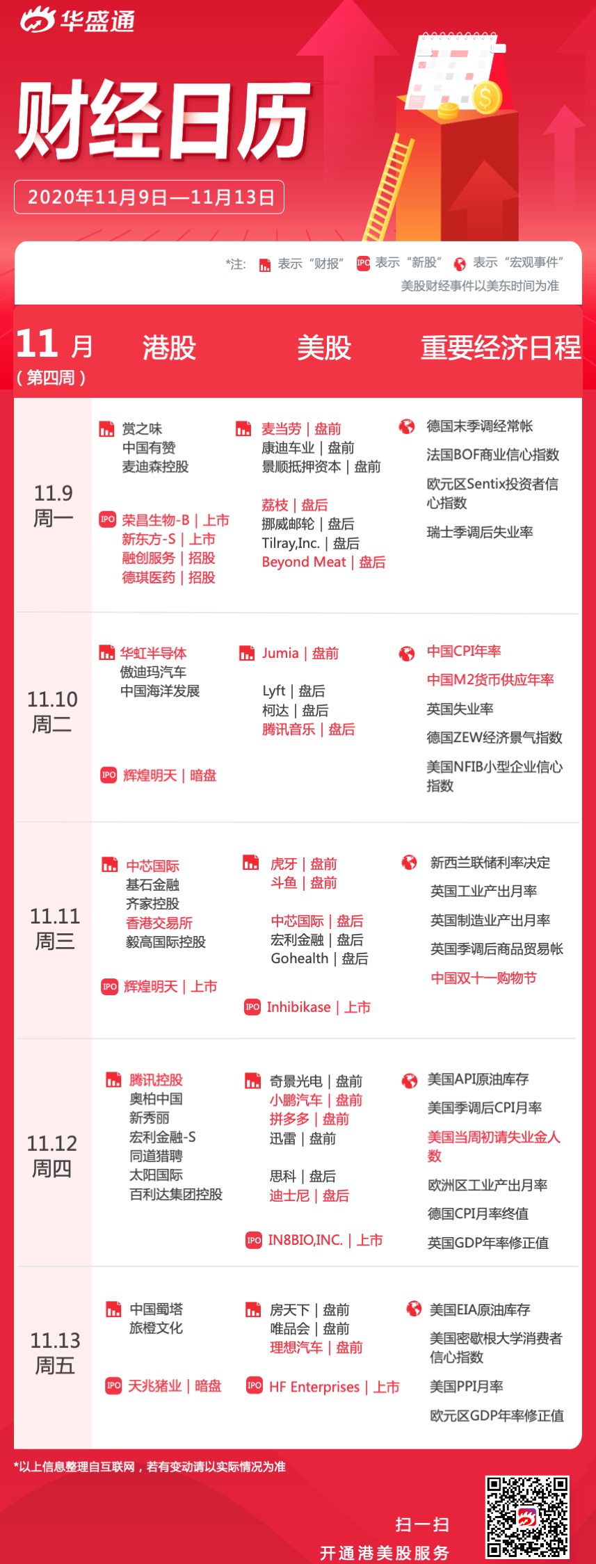 本周港股市场有相当多企业发布财报,其中“股王”腾讯控股为市场焦点,并将于周四发布财报。此外,小鹏汽车、理想汽车、拼多多、虎牙、斗鱼、腾讯音乐等中概股将陆续发财报,投资者或可保持关注。