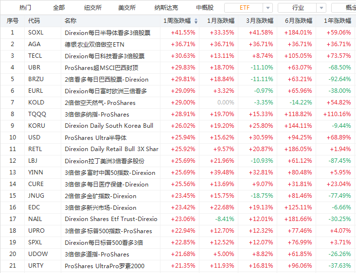 从ETF涨幅榜来看,美股科技股尤其是半导体板块最为强势,其次是巴西、欧洲、富时中国50等区域股指,相关ETF涨幅都颇为惊人,连位列涨幅榜20余名的3倍做多道指和罗素2000指数ETF都累涨超过20%。