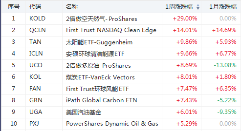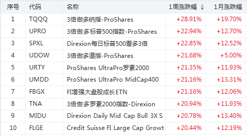能源上,天然气价格调整,2倍做空天然气的KOLD上周大涨29%。而原油走势仍反复,上周先涨后跌,随着美国周五单日新增确诊病例达到创纪录的12万,美油周五大跌4.3%,上周涨幅只剩下3.8%,2倍做多原油的UCO周涨近9%。