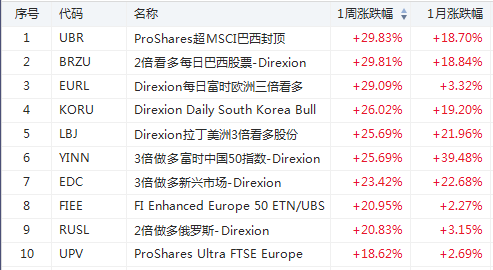 喜迎大选落地,全球股市都嗨了。区域ETF方面,或许是应了“跌的越狠,反弹越猛”,此前一周表现最差的MSCI巴西股指一扫颓势,2倍杠杆的UBR和BRZU双双大涨近30%。