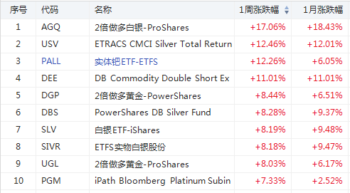 上周美元创3月以来的最大跌幅,使金价录得7月以来的最大周涨幅,黄金期货价格上周累计上涨3.8%,白银期货价格累计上涨8.5%,阔别已久的2倍做多白银的AGQ重现商品ETF涨幅榜榜首。