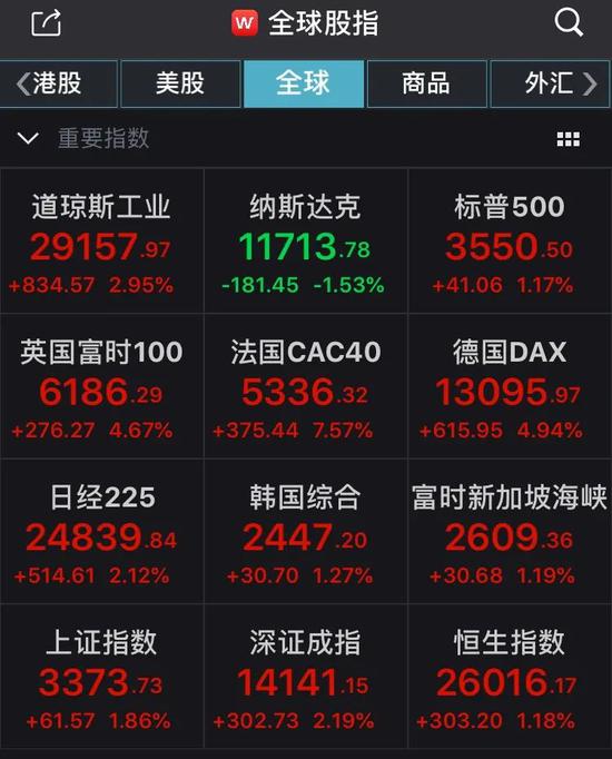 截至收盘,美股道指收涨逾830点,开盘一度涨逾1600点;英国富时100指数涨4.67%;法国CAC40指数涨7.57%;德国DAX指数涨4.94%;NYMEX原油期货收涨逾7%;COMEX黄金期货收跌4.58%。