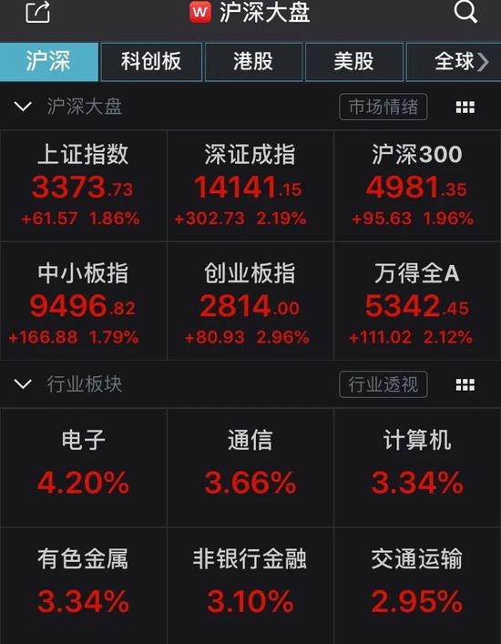 上证指数收盘涨1.86%,深证成指涨2.19%,盘中创出逾5年新高;创业板指涨2.96%,创3个月新高;两市成交额时隔两个月再度突破万亿元;北向资金全天净买入197亿元,创年内新高。