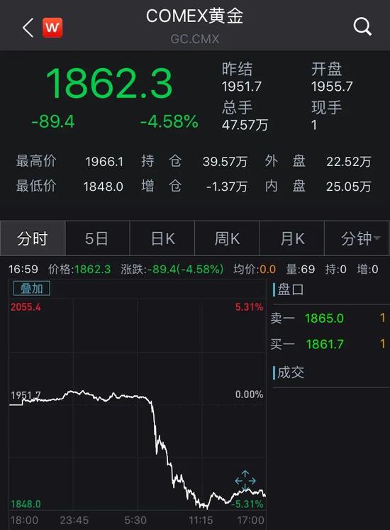 COMEX黄金期货收跌4.58%报1862.3美元/盎司,创8月11日以来最大单日跌幅;COMEX白银期货收跌5.91%报24.145美元/盎司。
