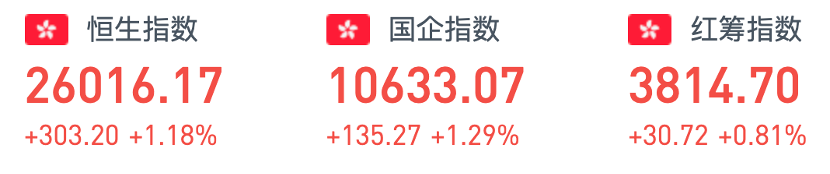 周一,恒生指数开盘涨1.73%,全天高位震荡。截至收盘,恒生指数涨303.2点或1.18%,报26016.17点,全日成交额达1684.53亿。国企指数涨1.29%,报10633.07点,红筹指数涨0.81%,报3814.7点。