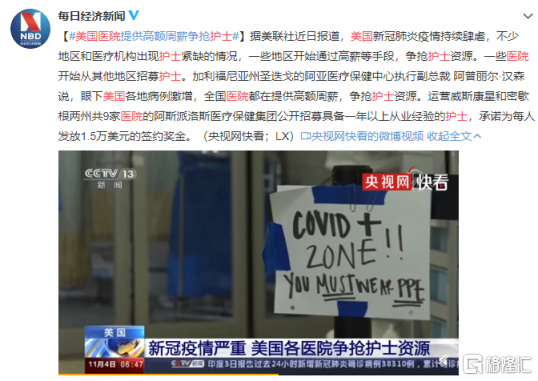 医院的负担加重,对医护人手的需求大量增加,很多医院在拼命争抢有经验有资质的护士,导致薪酬水平直线上升。“由于新冠大流行在全美蔓延,全美各地的医院都在争夺同一批护士,薪酬从每周1500美元到超过5000美元(约合人民币1万至3.3万元)不等。”美国医疗机构Aya Healthcare的执行副总裁April Hansen说道。他表示,现在把护士安置到需要的地方就像“打地鼠游戏”一样。