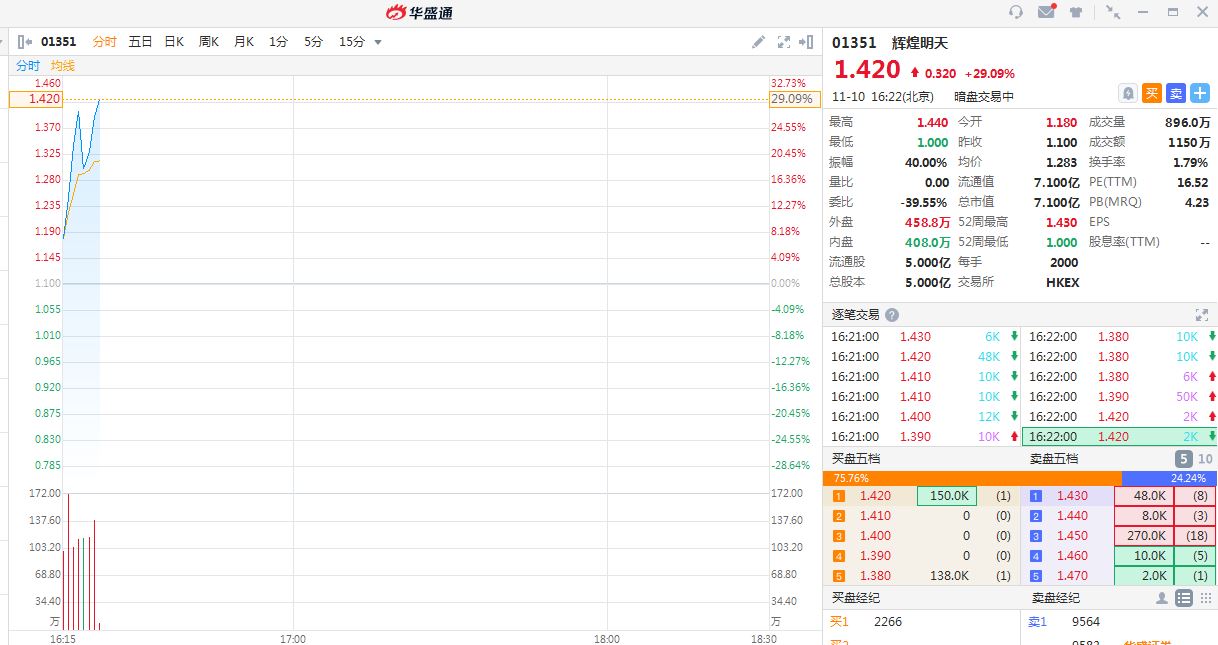辉煌明天今日开启暗盘交易,暗盘股价高开高走,目前辉煌明天涨29.09%,不计手续费,一手浮盈640港元。预期股份将于明日上午九时正开始于联交所主板买卖。股份将以每手2000股股份的买卖单位进行买卖。