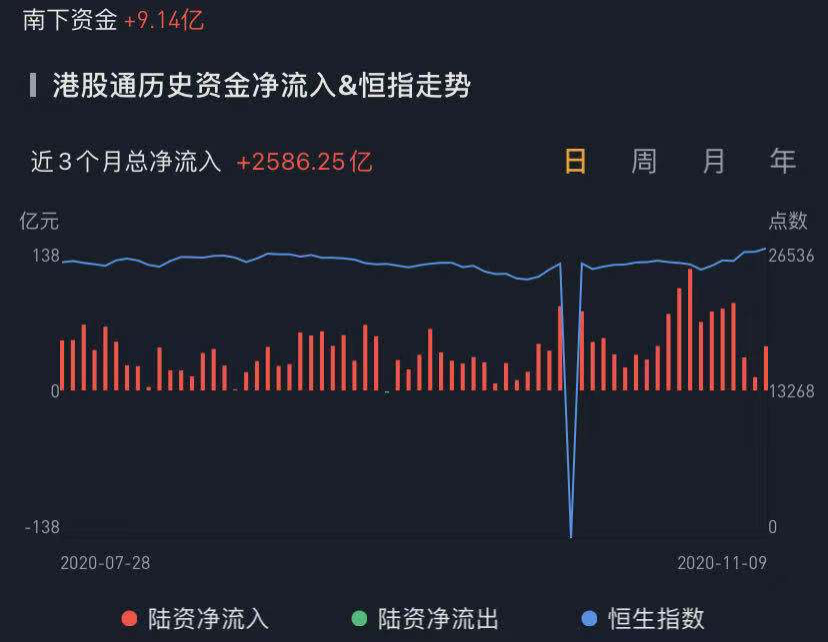 南下资金今日净流入港股9.14亿港元,流入规模环比骤减。