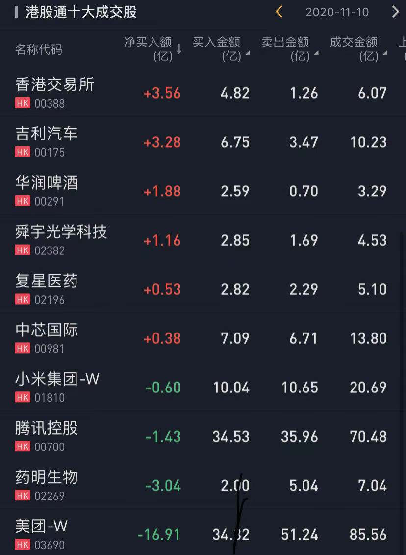 个股方面,今日南下资金净买入港交所3.56亿港元,净买入吉利汽车3.28亿港元,净买入华润啤酒1.88亿港元。此外,南下资金净卖出美团16.91亿港元,为今日抛售之最。