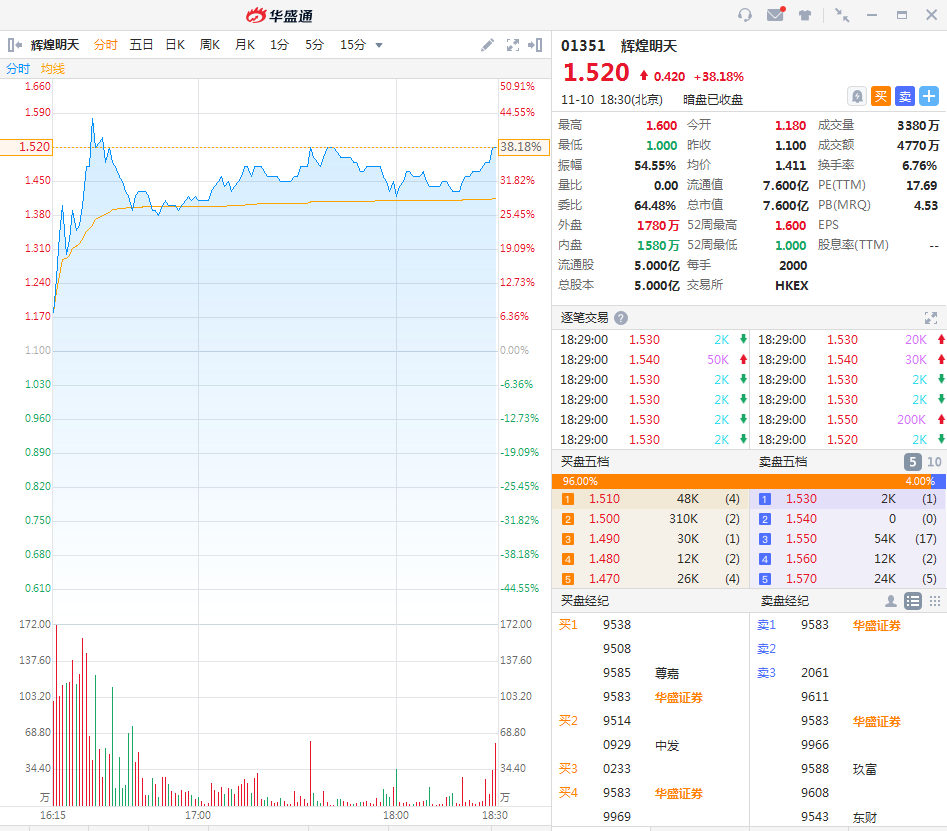 华盛资讯11月10日讯,辉煌明天(01351.HK) 暗盘收盘报价1.52港元,较发行价1.1港元涨幅为38.18%,一手账面盈利840港元。暗盘成交额4770万港元,总市值为7.6亿港元,该股将于明日(11月11日)正式上市。
