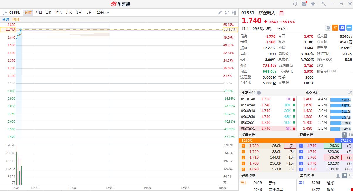 辉煌明天(01351.HK) 今日挂牌,首日股价大幅高开,目前涨近60%,不计手续费,一手浮盈1280港元。