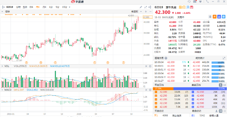 蒙牛乳业(2319.HK)高开高走,现涨4.44%暂领涨恒指成份股,盘中高见42.65港元创新高。暂成交1.8亿港元,总市值达1669亿港元。