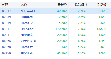 11月11日消息,前期大涨股集体回调,华虹半导体跌超12%,比亚迪股份跌超7%,福莱特玻璃跌超6%;港口股中集集团跌超10%,中远海控跌超7%,中远海发跌超5%。阿里健康跌近7%,复星医药等跌超5%。